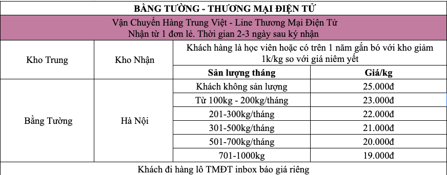 – Freeship nội thành Hà Nội với sản lượng 200kg/chuyến áp dụng báo đóng bao sẵn tại đầu Trung Quốc
